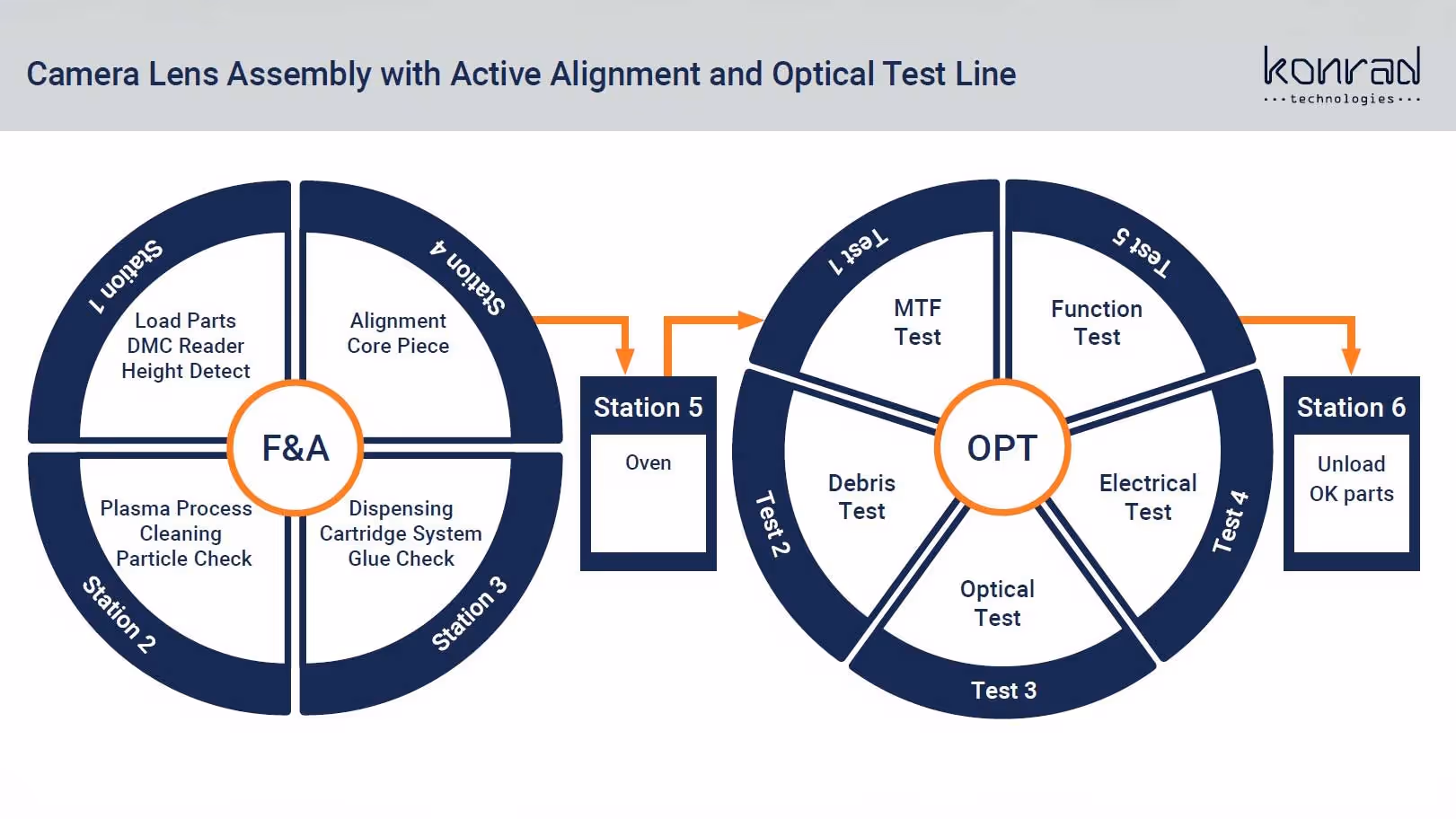 Für die Montage der Kameramodule wurden 6 vollautomatische Stationen entwickelt: Loading/Unloading, Plasma, Dispensing, Alignment, Oven, Optical Tester. Jede Station hat ihre spezifische Funktion: